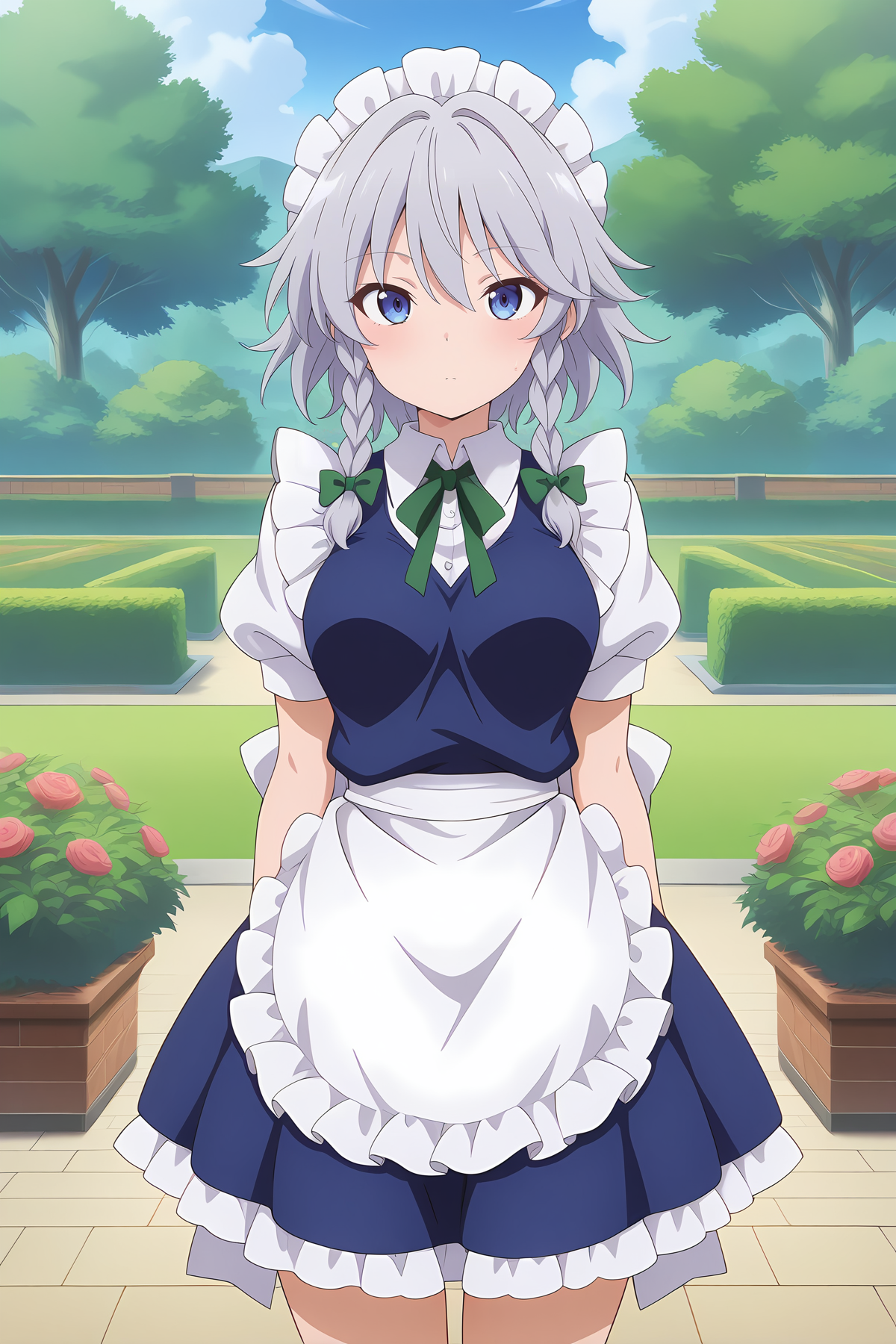 izayoi sakuya, 1girl, solo, blue eyes, twin braids, medium breasts,