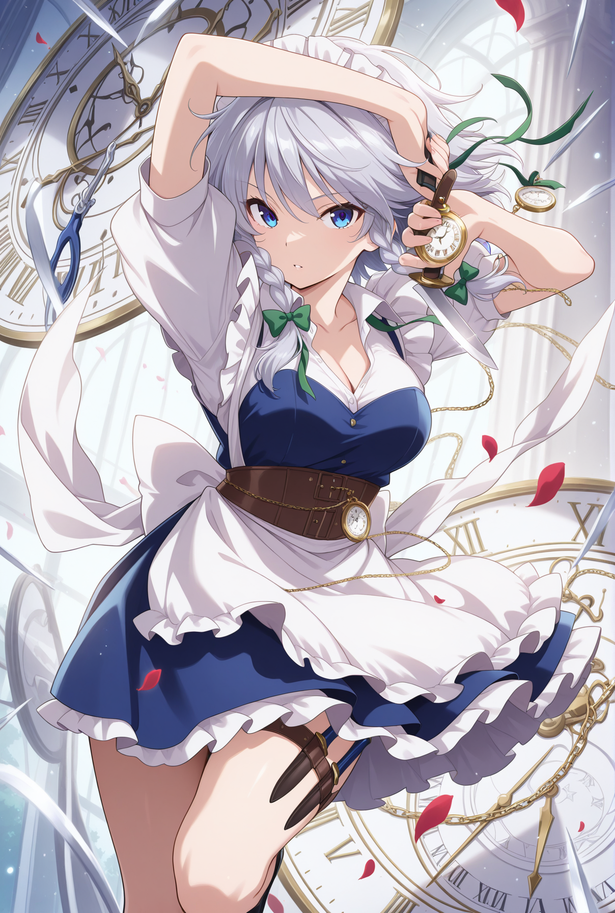 izayoi sakuya, 1girl, solo, grey hair, blue eyes, short hair, side braids, twin braids, braid, breasts,, alternate costume, eye mask, hair bow, green bow, maid headdress, wrist cuffs, waist apron, white apron, back bow, white bow, thigh strap, red cape, torn cape, pocket watch, mini-hakero,