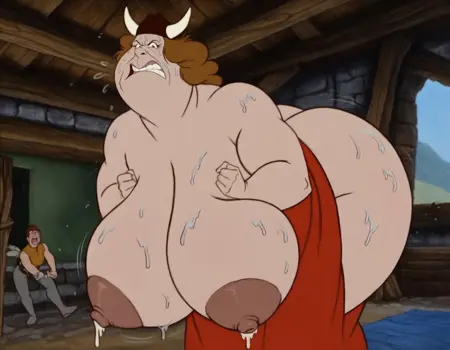 obese,mature woman,Valkyrie outfit,black bra,red skirt,black shoes,brown hair in pigtails with pink ribbons,helmet with horns