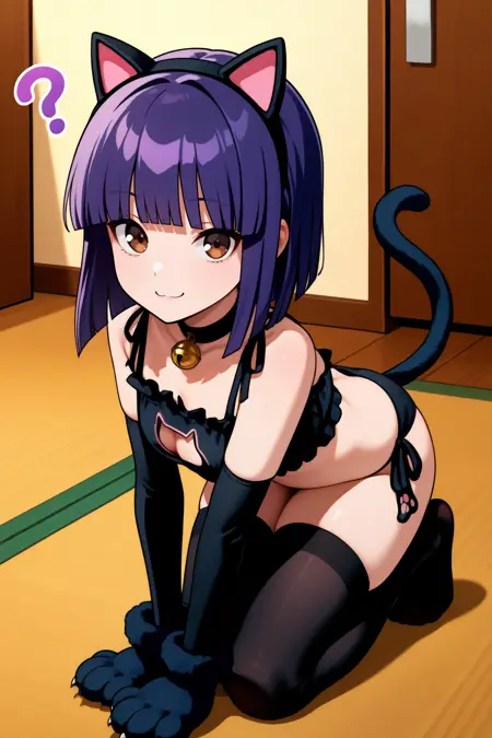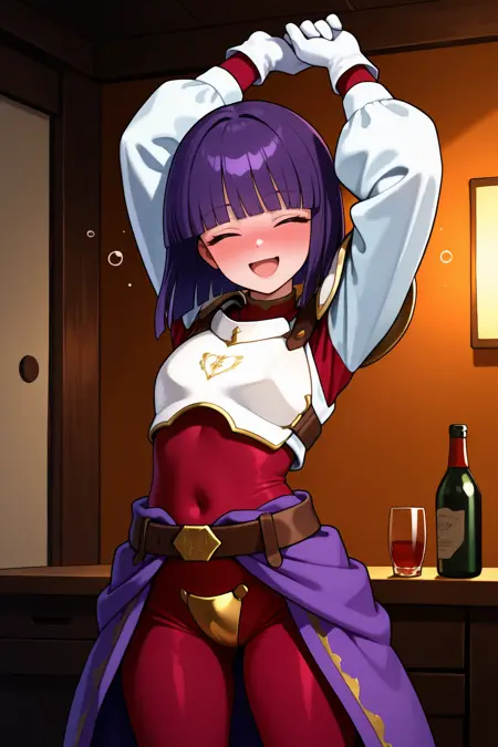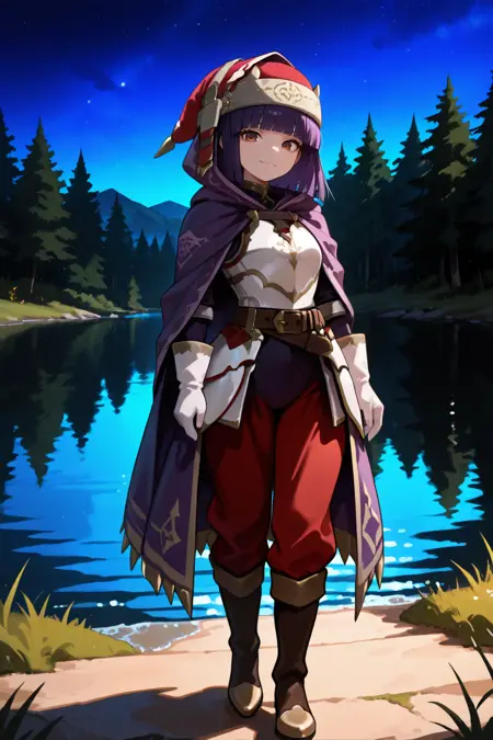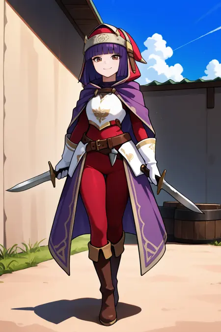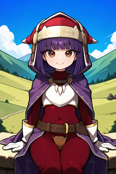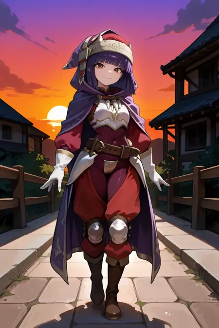 • 전신 2: 1girl, 보라색 머리카락, 단발, 둔한 앞머리, 둔한 끝, 갈색 눈, 후드, 후드 올린, 후드가 달린 망토, 보라색 망토, 모자 장식, 빨간 모자, 회색 헤어밴드, 가슴 판, 빨간 갑옷, 빨간 셔츠, 벨트, 보라색 허리 망토, 장갑, 검은 바지, 부츠