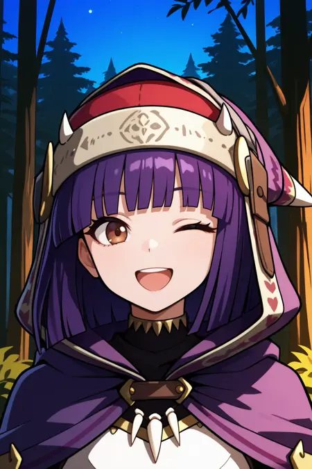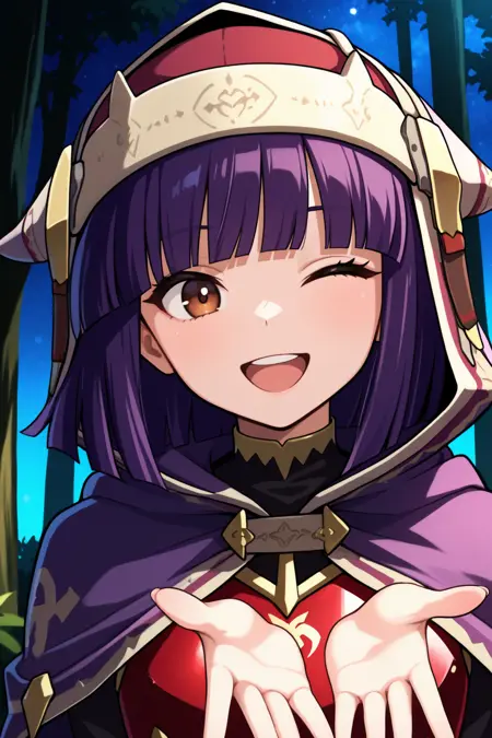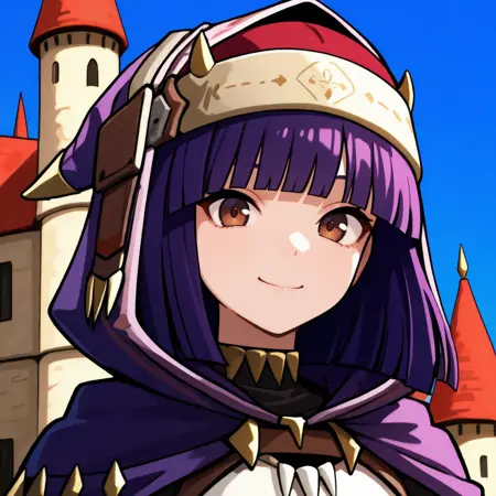 • 초상화: 1girl, 보라색 머리카락, 단발, 둔한 앞머리, 둔한 끝, 갈색 눈, 후드, 후드 올린, 후드가 달린 망토, 보라색 망토, 모자 장식, 빨간 모자, 회색 헤어밴드,