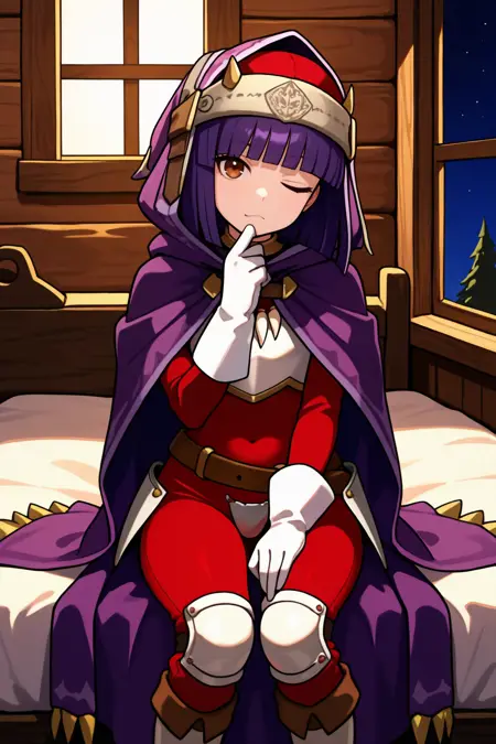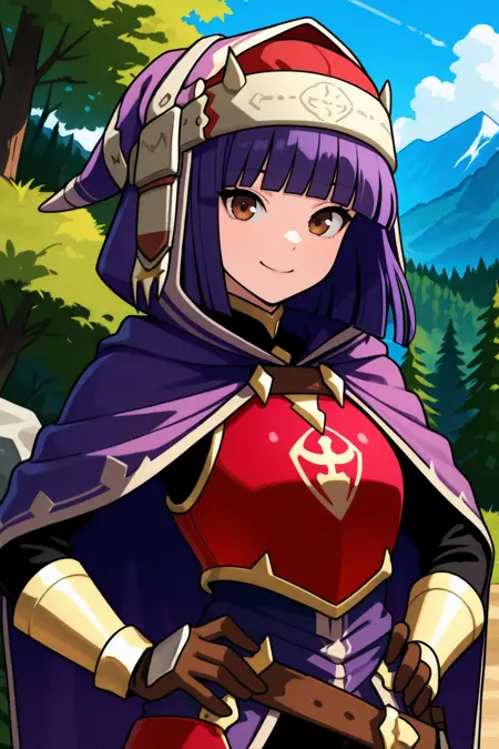 全身2: 1girl,紫色头发,短发,齐刘海,直发尾,棕色眼睛,兜帽,兜帽戴起,带帽斗篷,紫色斗篷,帽子装饰,红色帽子,灰色发带,胸甲,红色盔甲,红色衬衫,腰带,紫色腰裙,护手,黑色裤子,靴子