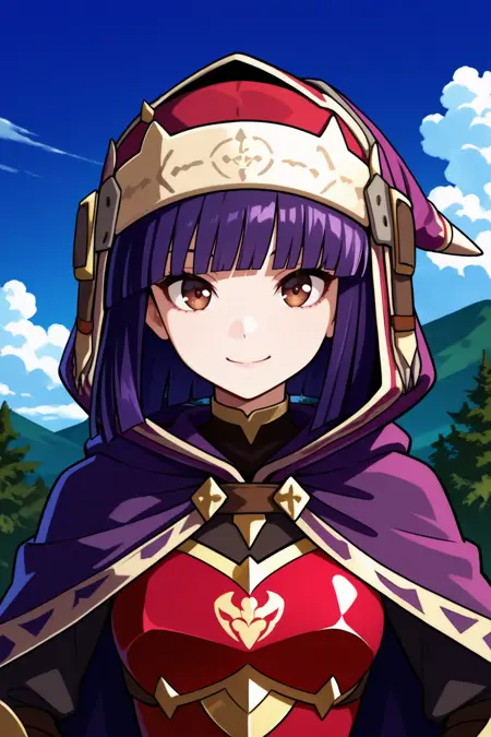 肖像: 1girl,紫色头发,短发,齐刘海,直发尾,棕色眼睛,兜帽,兜帽戴起,带帽斗篷,紫色斗篷,帽子装饰,红色帽子,灰色发带,