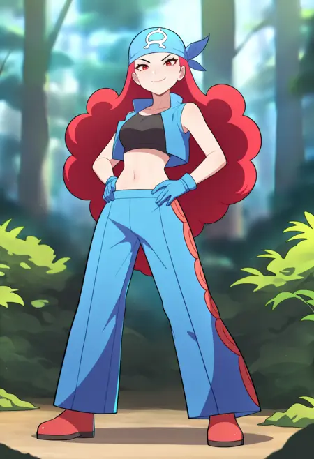 Outfit prompts : bandana, crop top, vest, open clothes, sleeveless, navel, midriff, blue gloves, blue pants, red shoes