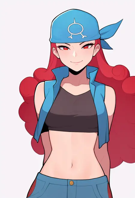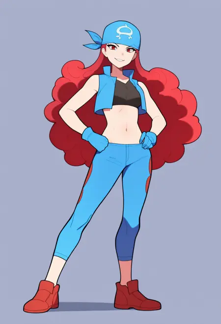 衣装プロンプト:bandana, crop top, vest, open clothes, sleeveless, navel, midriff, blue gloves, blue pants, red shoes