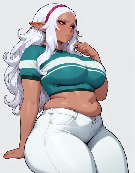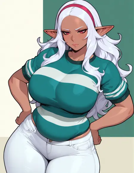 "kuroedsto, 눈 밑 모반, 뾰족한 귀, 어두운 엘프, 검은 피부를 가진 여성, 붉은 눈, 긴 머리, 청바지, 헤어밴드, 흰색 머리, 줄무늬 셔츠, 흰색 바지, 짧은 소매, 통통한, 살이 많은"