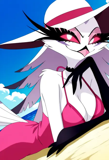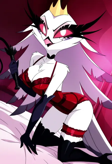 stella \(helluva boss\), stella, 兽耳女性, 猫头鹰, 魔鬼猫头鹰, 红眼睛, 白色瞳孔, 长睫毛, 白色身体, 白色羽毛, 羽毛发型, 长发, 眼影, 喙, 粉色喙, 鸟尾, 尾羽