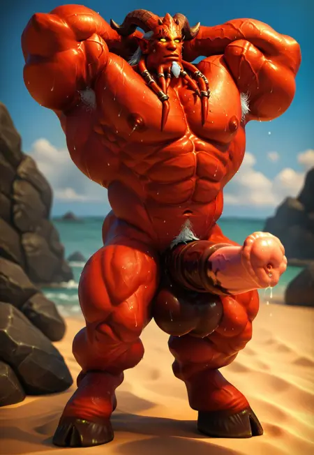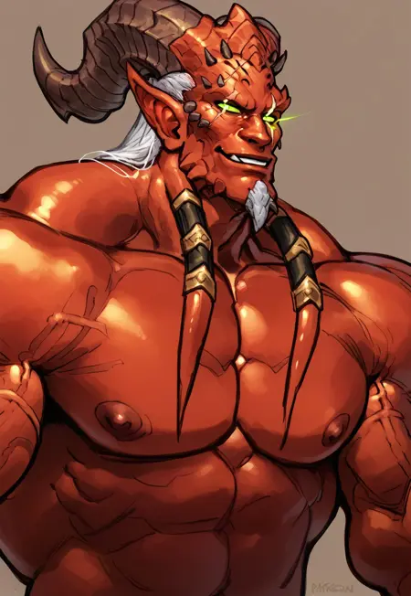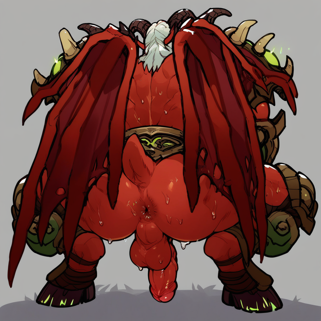 1boy, wow_kiljaeden, horns, pointy ears, glow green sclera, red skin, muscular, white hair, white goatee, eye scar, goat legs, tail, wings, necklace, pauldrons, oversleeve, loincloth, legs armor,