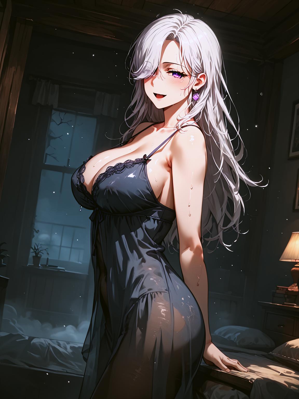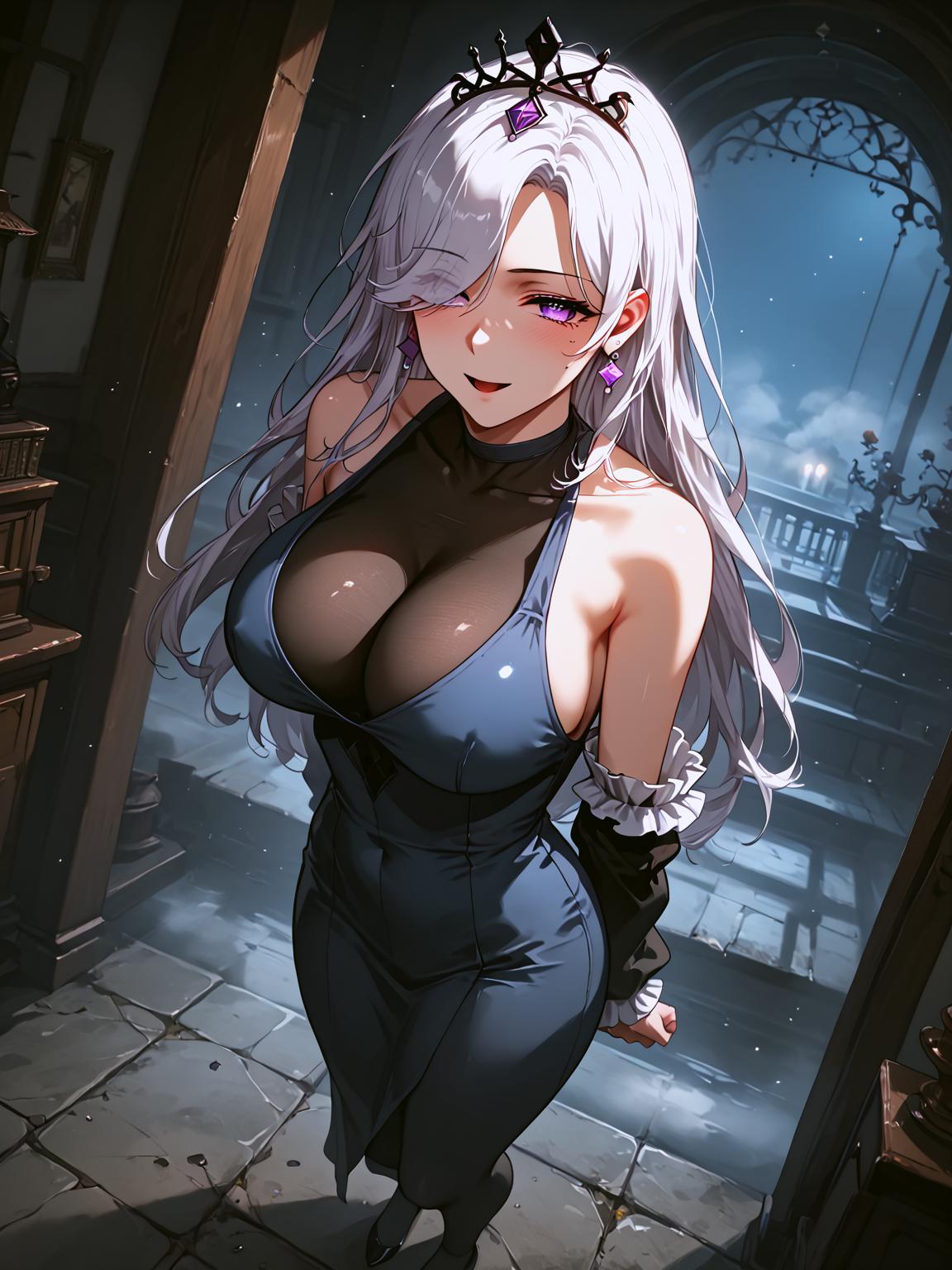 long hair, white hair, purple eyes, bare shoulders, mole under eye, bangs, hair over one eye,