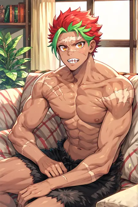 1boy, p4kkya, dark skin, muscular, short hair, scar, sharp teeth, topless male, solo, red hair, two tone hair, green highlights, orange eyes,