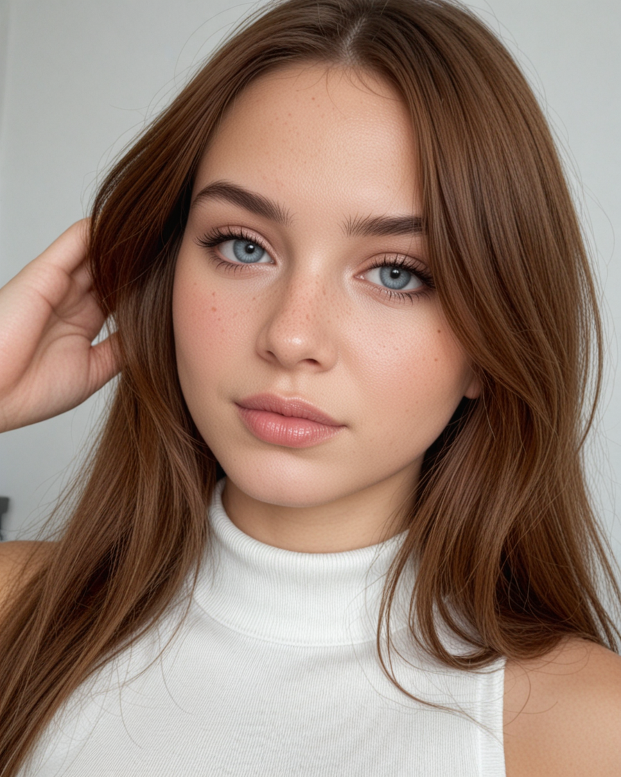 – Light, natural pores and freckles (((freckles))) with realistic catch‑lights (((catch-lights)))