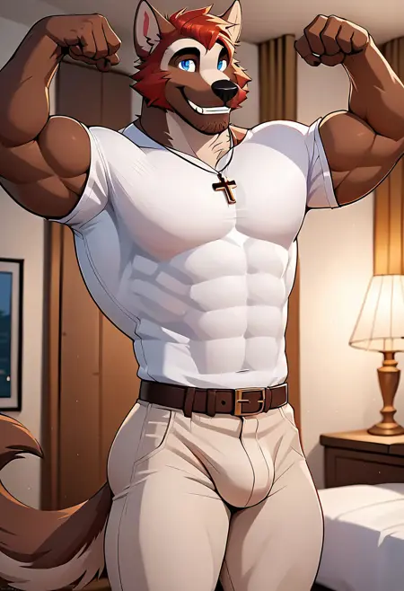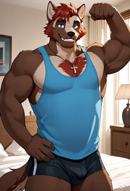 强化提示:“狼、毛茸茸、尾巴、蓝眼睛、棕色皮毛、红发、黑色小胡子、肌肉发达、 bara、成熟男性、宽阔胸肌”