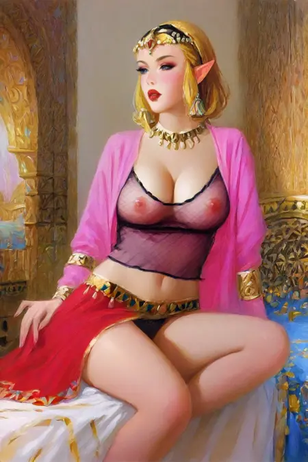 fishnet gloves, elbow gloves, black flower hat, veil, jewelry, earrings, dress, arabian clothes, cleavage, necklace, brown hair, bracelet, high heels, blonde hair, red lips, hair bun, choker, strapless, corset, bare shoulders, red dress, red lips, looking to the side, see-through