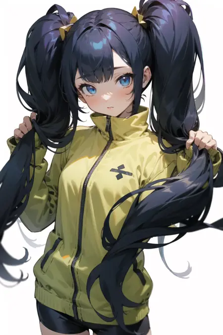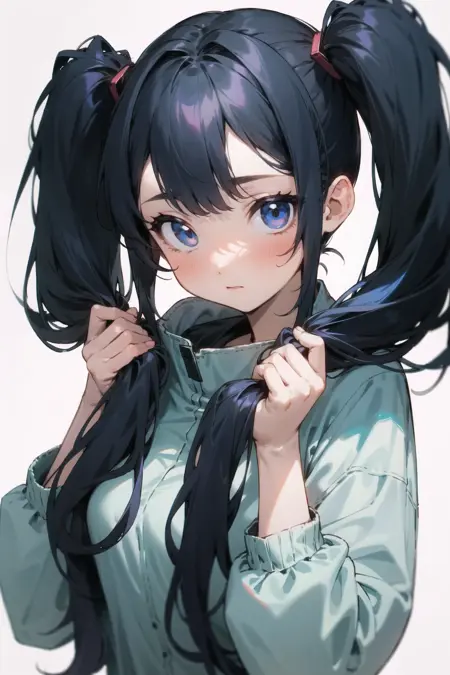 holding twintails, holding hair, twintails,