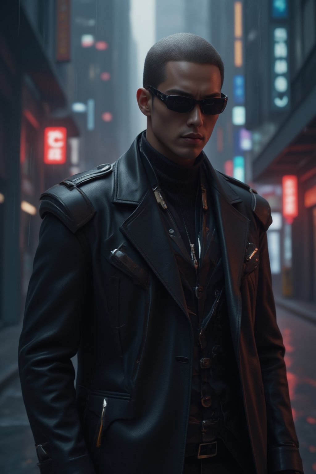 使用提示词指定角色特征,例如“赛博植入体”、“长风衣”或“能量武器”。