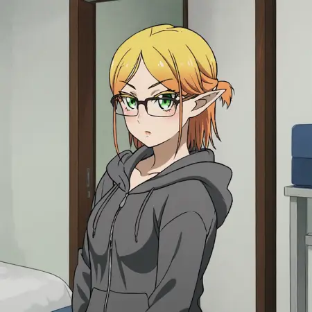 안경 트리거: SuiGlasses, 1girl, 뾰족한 귀, 금발 머리, 안경, 후드 아래로, 녹색 눈, 후드, 반쯤 올린 머리, 안경 쓴, 짧은 머리, 카우보이 샷