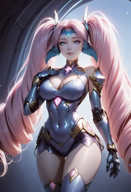 1girl, 粉色头发, 单人, 长发, 双马尾, 钻头发型, 紫色眼睛, 蓝色头翼, 蓝色额饰, 头饰,
