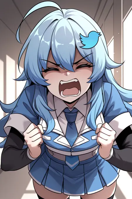 Add "twchan, blue hair, hair between eyes, sidelocks, ahoge, long hair, blue eyes, blue hairpin, bird hairpin, blue jacket, cropped jacket, white shirt, blue necktie, layered sleeves, blue skirt, pleated skirt, black thighhighs" for Twitter-chan.