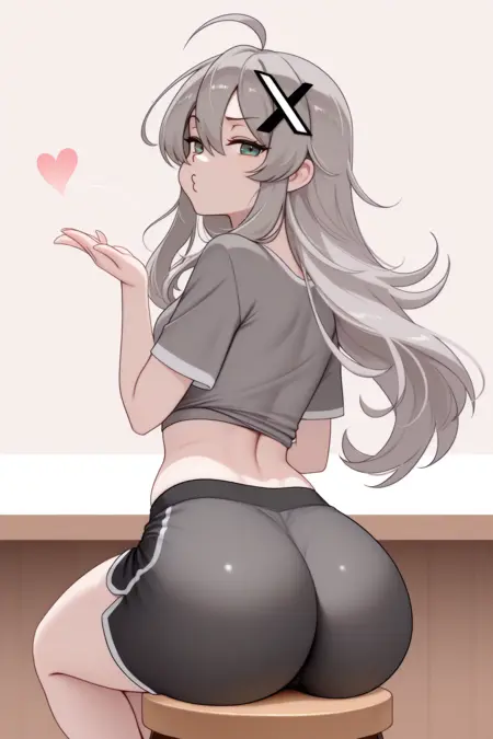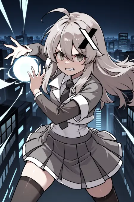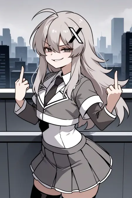 Add "xch, grey hair, long hair, hair between eyes, sidelocks, ahoge, grey eyes, hair ornament, grey jacket, cropped jacket, black necktie, layered sleeves, white shirt, collared shirt, grey skirt, pleated skirt, black thighhighs" for X-chan.