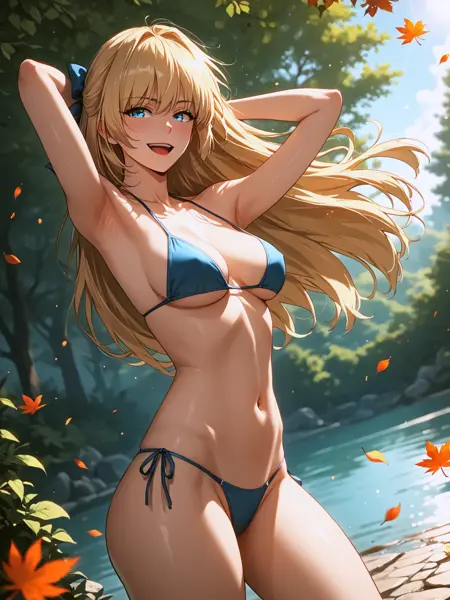 Teresa, blue eyes, blonde hair, long hair, ribbon on hair, battle uniform, white cape, armor