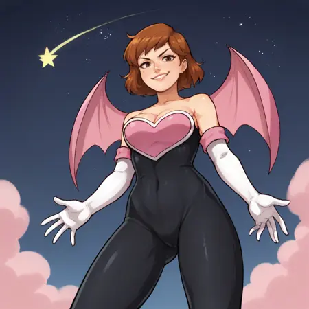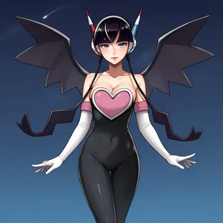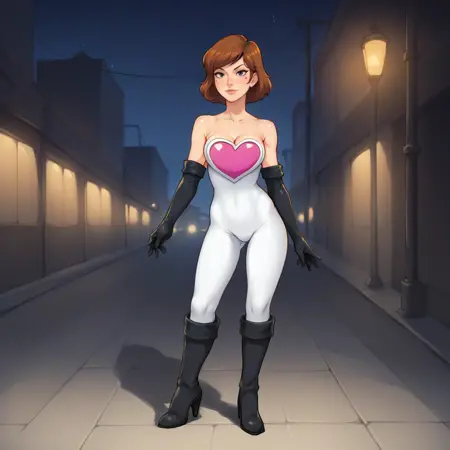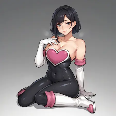 elbow gloves, white gloves, white boots, heels, black bodysuit, pink chest-piece, bare shoulders