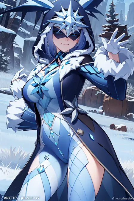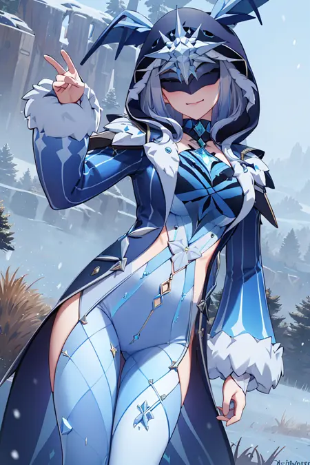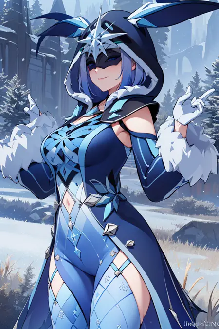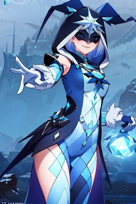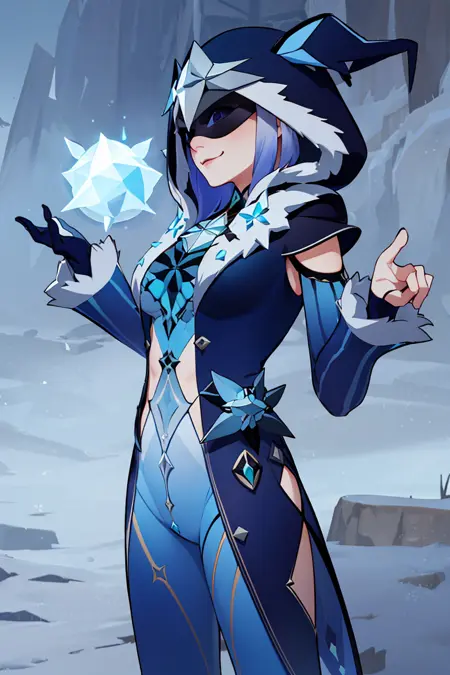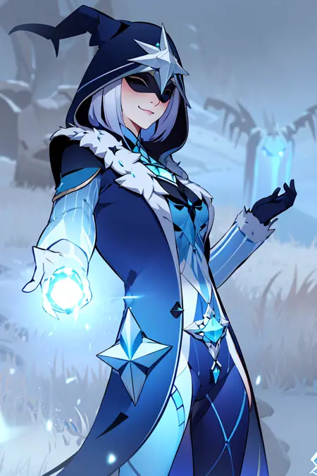 追加プロンプト: solo, evil smile, ice magic, eye mask, detailed hood