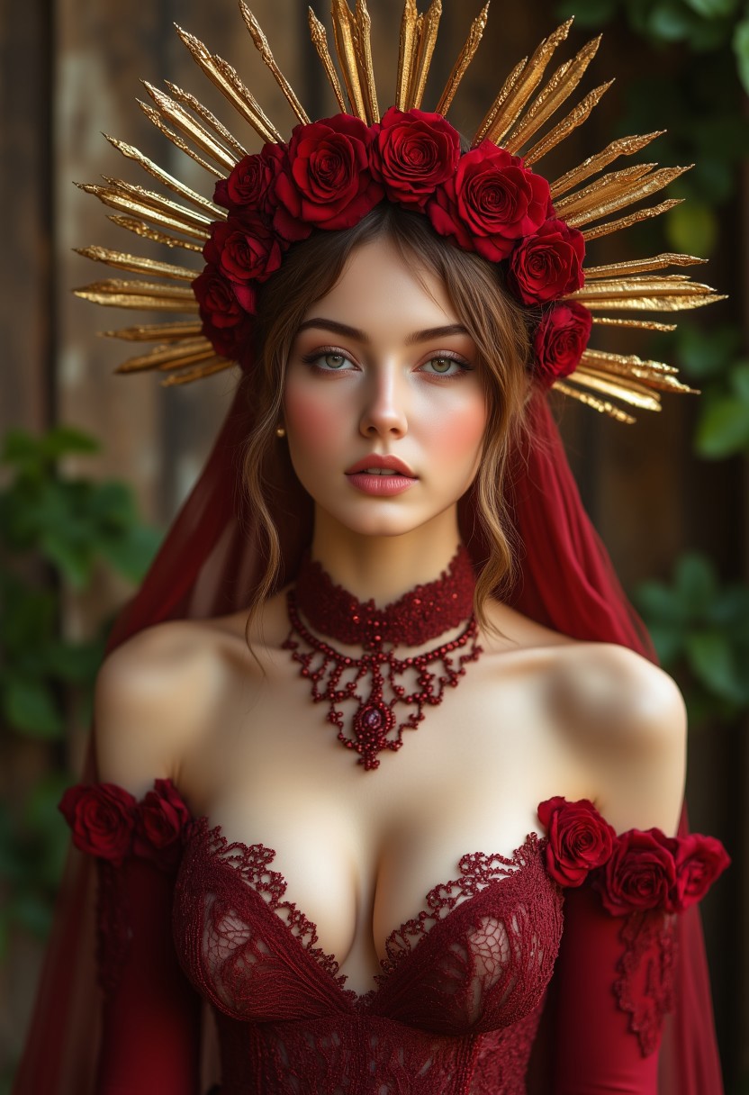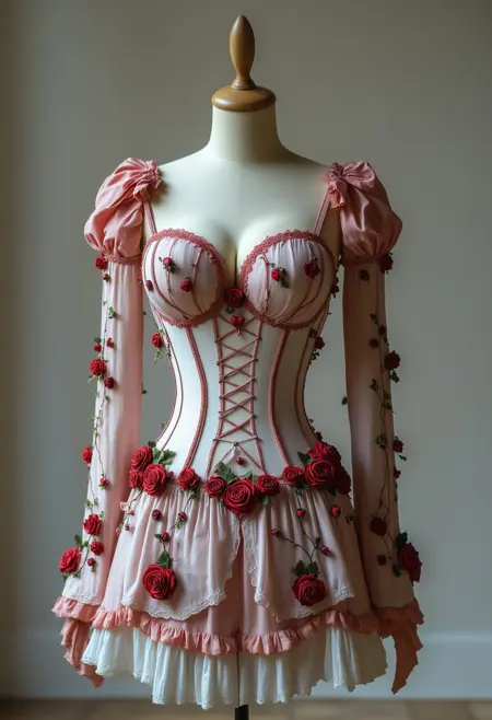 装甲、前卫、巴洛克、胸衣、连体衣、波西米亚、项圈、束腰、赛博朋克、刺绣、花卉、蓬松、礼服、哥特、心形、高领、蕾丝、乳胶、皮革、霓虹、奢华、繁复、吊坠、红玫瑰、玫瑰图案、玫瑰、褶边、缎面、透明、裙摆、心形领口、王冠、丝绒、维多利亚、 voluminous、 whimsical、翅膀。