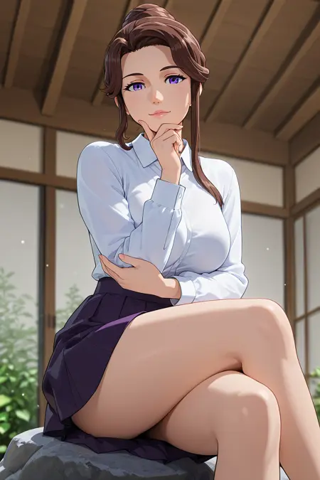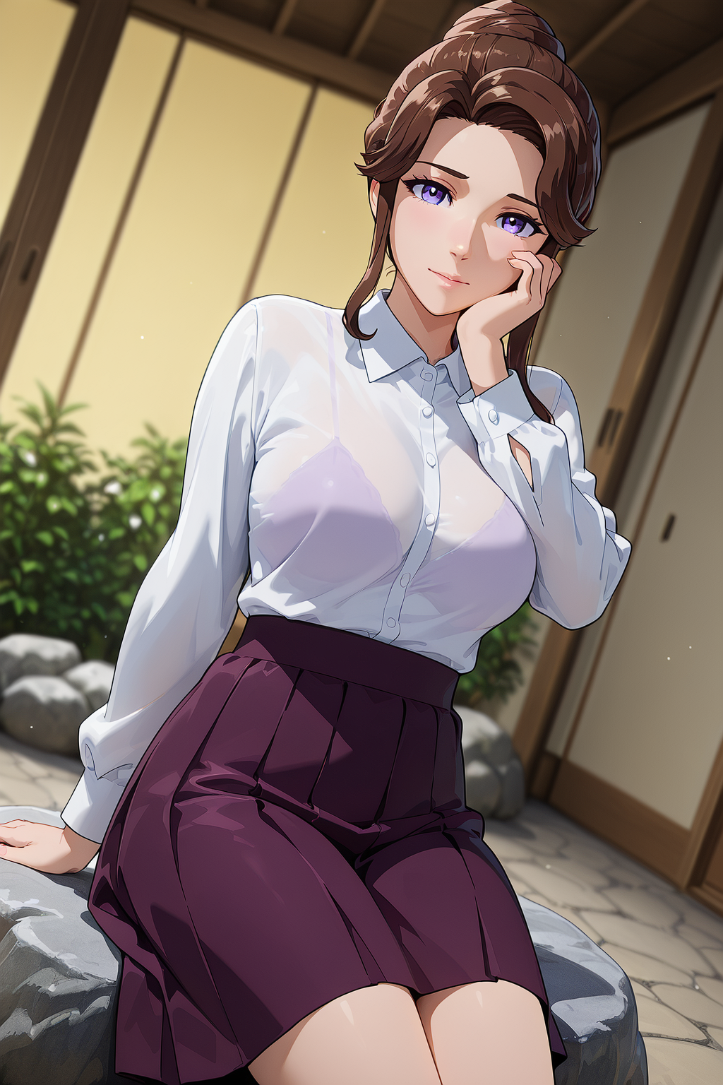 (shirt, white_shirt, long_sleeves, collared_shirt, skirt, purple_skirt),