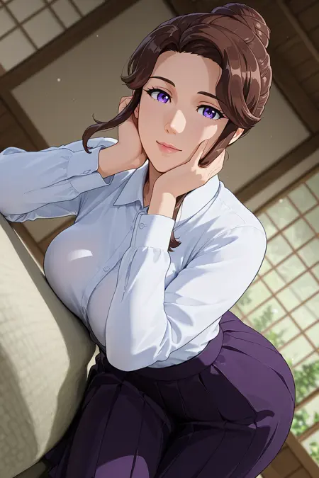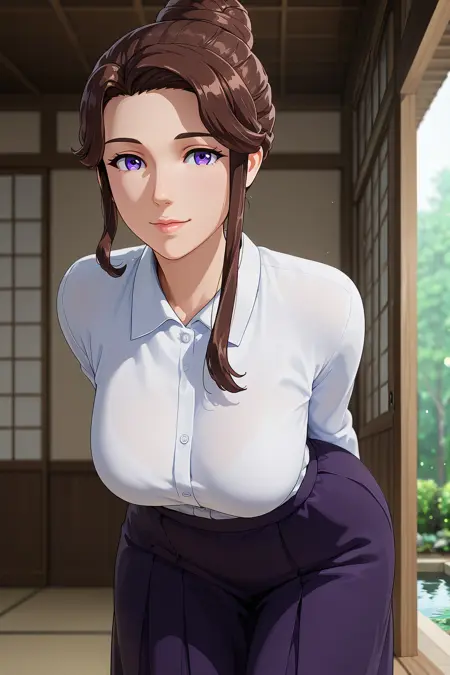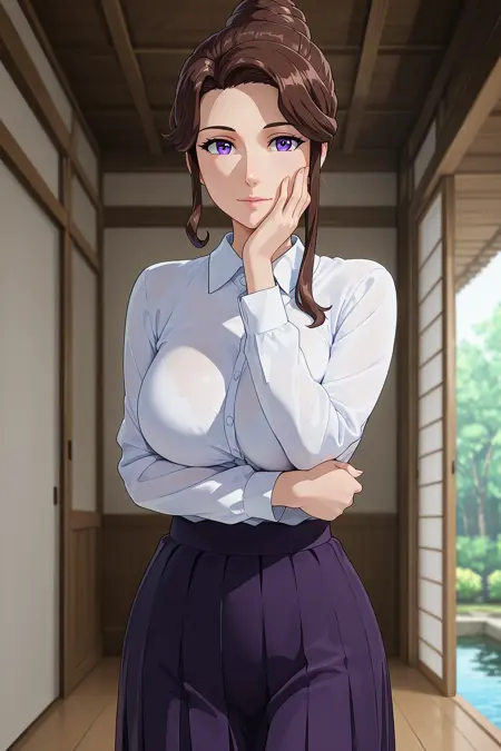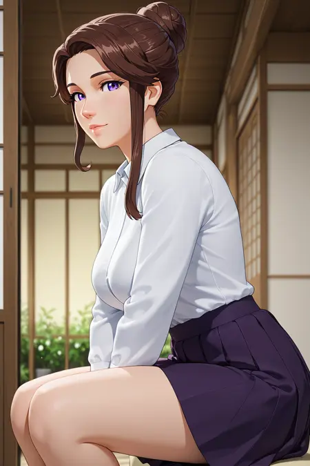 (long_hair, brown_hair, purple_eyes, sidelocks, hair_bun, single_hair_bun),