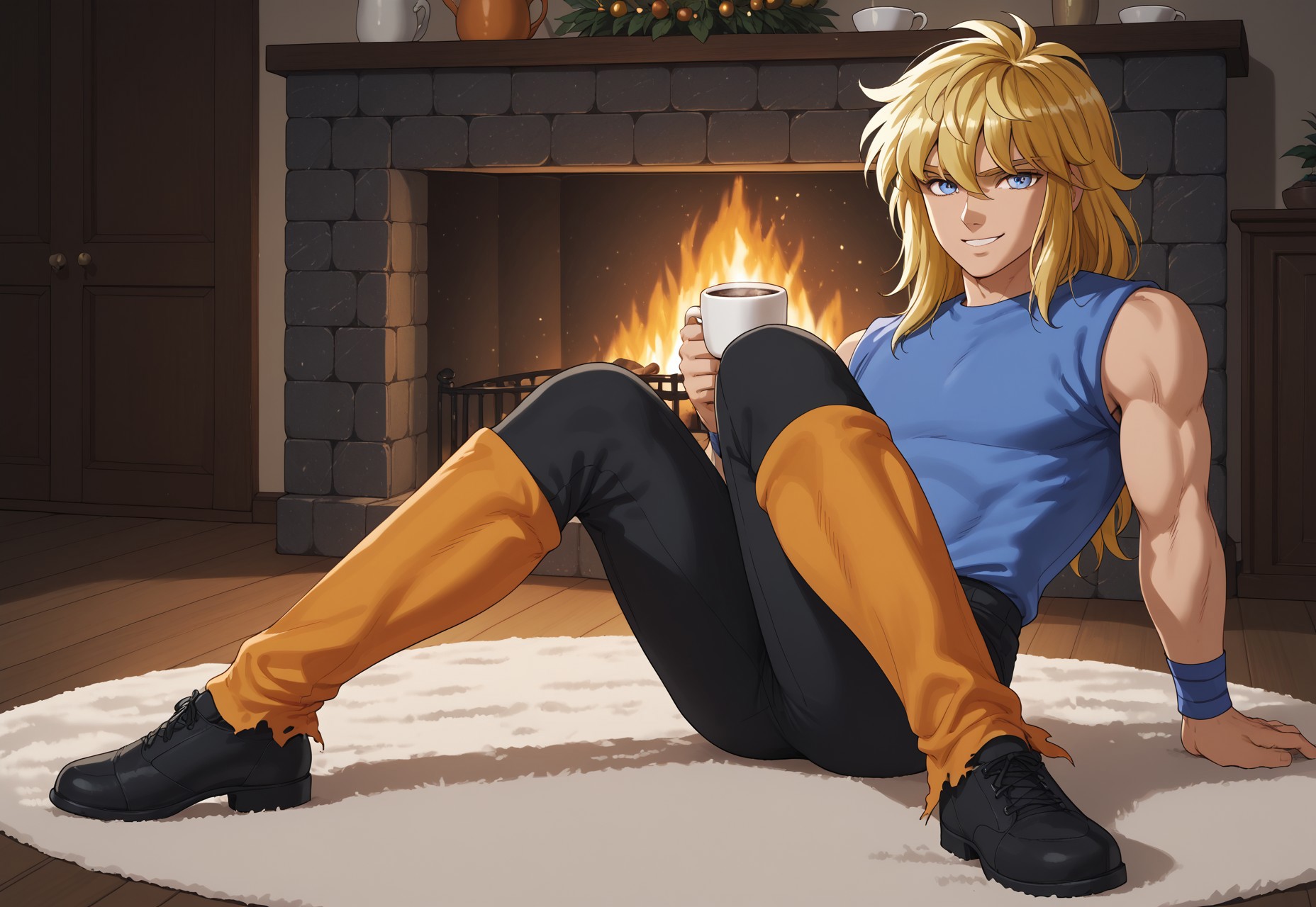 1boy, blue eyes, slender figure, toned male, wavy blonde hair, blue sleeveless shirt, blue wristbands, black pants, orange leg wraps, black shoes