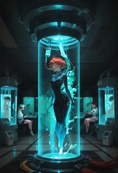 확장 프롬프트: 과학적, 실험, 실험 대상, 포함된, 정지 액체, 관류, 호흡기 마스크, 배액관, 영양관, 케이블, 기포, 떠 있는