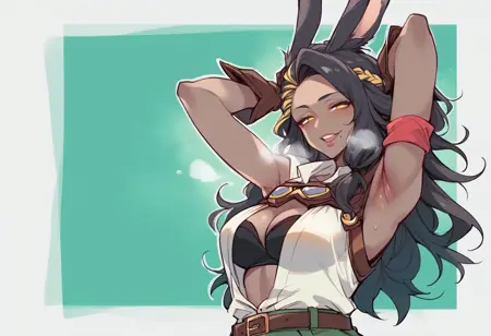 Trigger: "cahc1ua, long hair, mole under mouth, black hair, multicolored hair, braid, yellow eyes, viera, dark skin" always needed for accuracy.