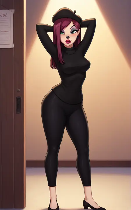MAIN_BeretGirl_ownwaifu, dog girl, furry female, 1girl, animal nose, beret, black headwear, black nose, breasts, dark skin, eyelashes, green eyes, hair behind ear, long hair, purple eyeshadow, red hair, red lips, straight hair, hat, makeup, lipstick, black sweater, black dress, long sleeves, jewelry, medium breasts, earrings, black pants, hair over one eye, turtleneck, turtleneck sweater, black leggings, layered sleeves, short sleeves, swept bangs, stud earrings, wide hips,