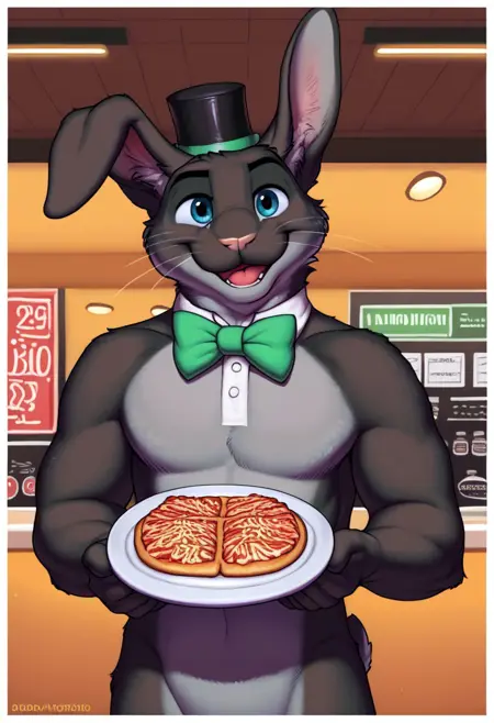 1boy, male, solo, solo male, gray body, dark gray body, dark gray, dark gray fur, lighter grey stomach, lighter stomach, grey only, bow tie, green bow tie, top hat, black top hat, green bowtie, shiny skin, shiny body, red cheeks, cheeks, blue eyes, buck teeth, rabbit, anthro rabbit