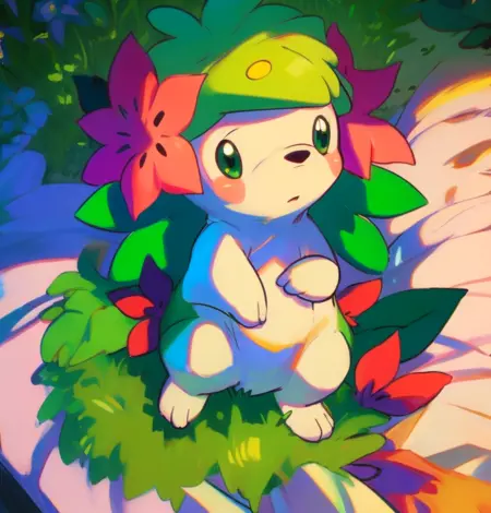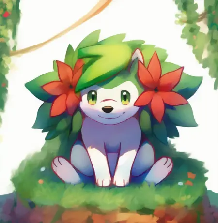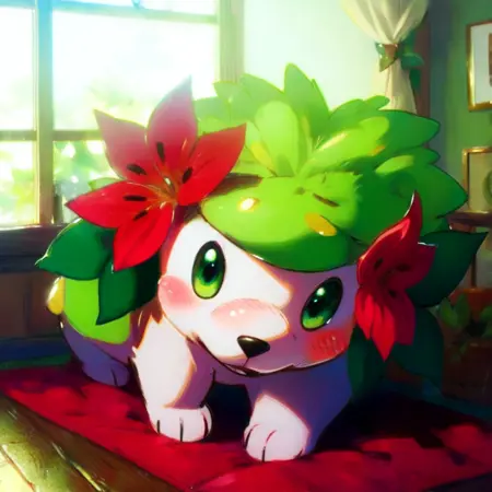建议prompt:shaymin,刺猬状生物,绿色毛发,头部两侧各有一朵红花,四足动物,
