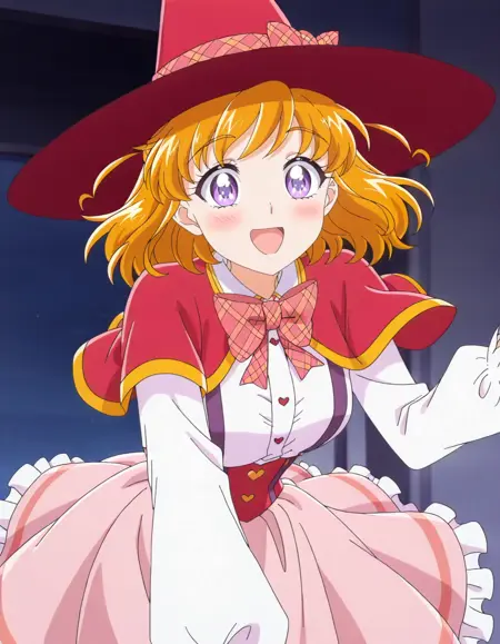 score_9, score_8_up, score_7_up, 动画截图, 单人,1女孩,asahinamiraimd, 校服, 女巫, 粉色女巫帽, 粉色裙子, 花边裙, 小斗篷, 背带, 紫色眼睛, 金色头发, lora:asahinamiraimd:0.8