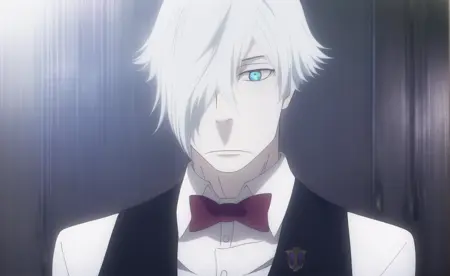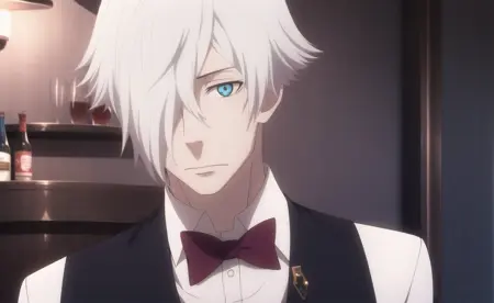 <lora:DeathParadeDecim-v2-04:0.7>, ChopioDecim, 白发, 短发, 发丝遮住一只眼睛, 蓝眼, +_+, 苍白肤色, 盯着观众,