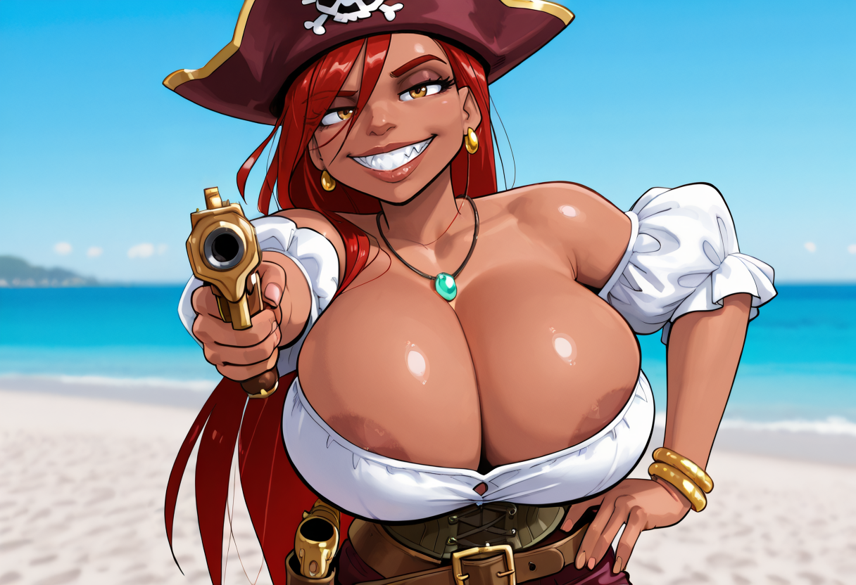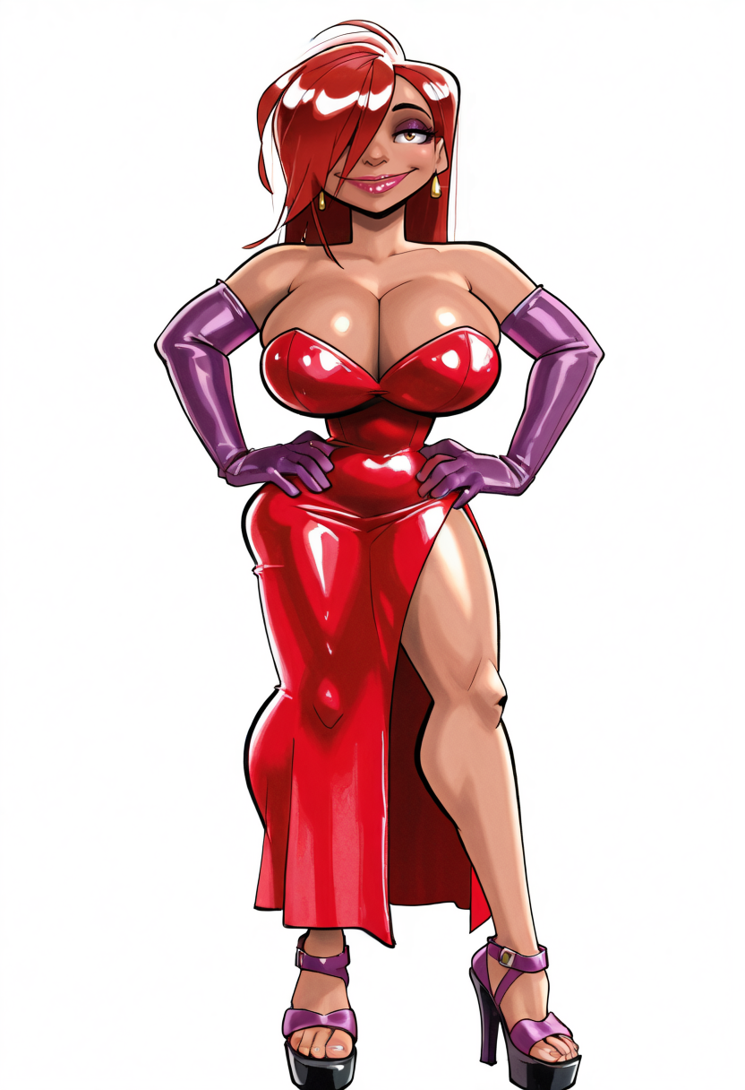 1girl, monica, very short, red hair, dark skin, huge breasts, full lips, slim waist, small ass, round ass,