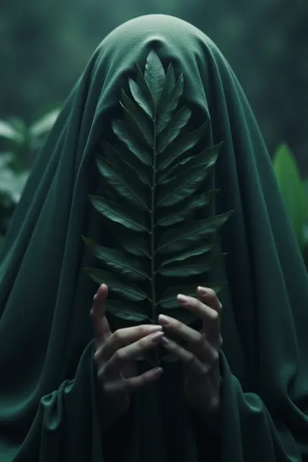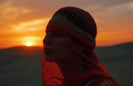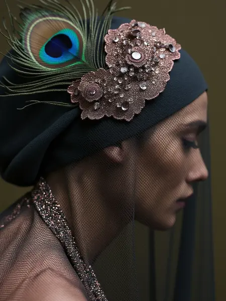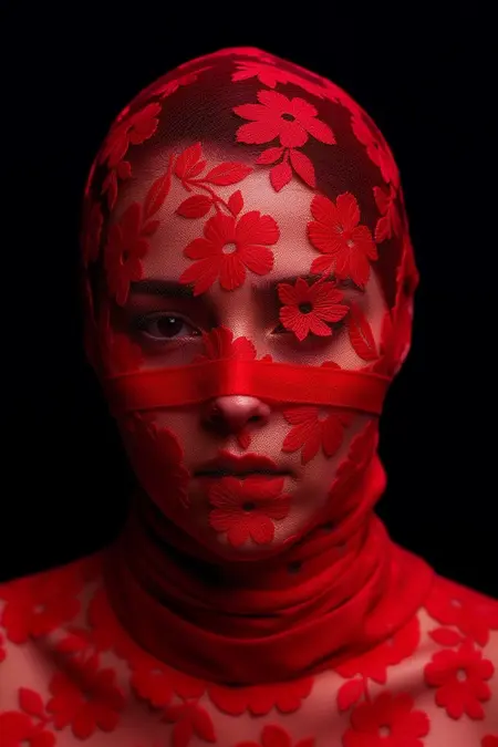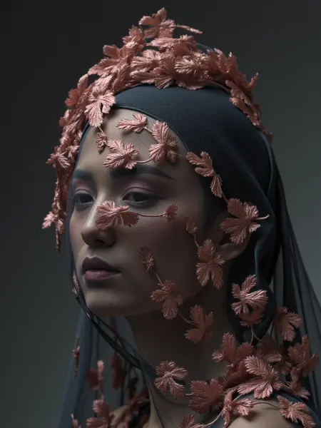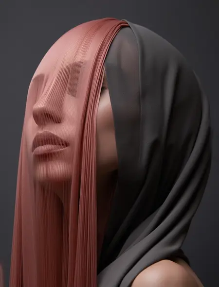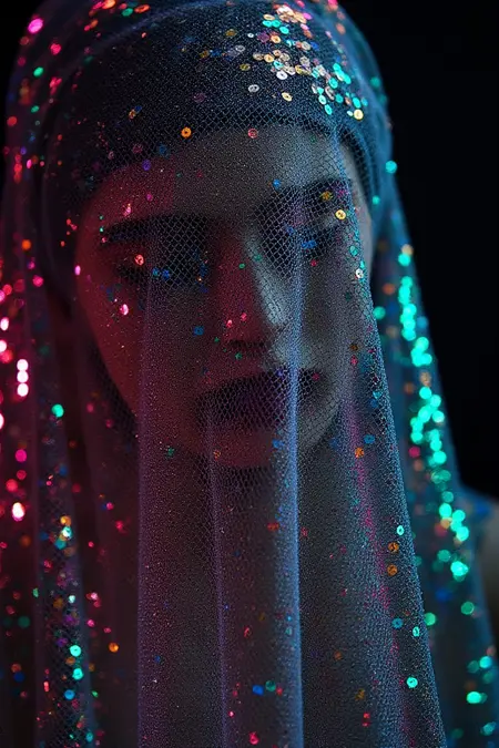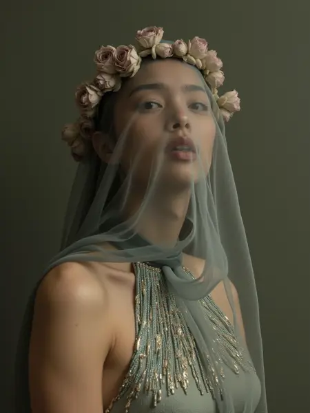 주제: veiled, obscured, headpiece, headdress, draped, flowing fabric, tulle