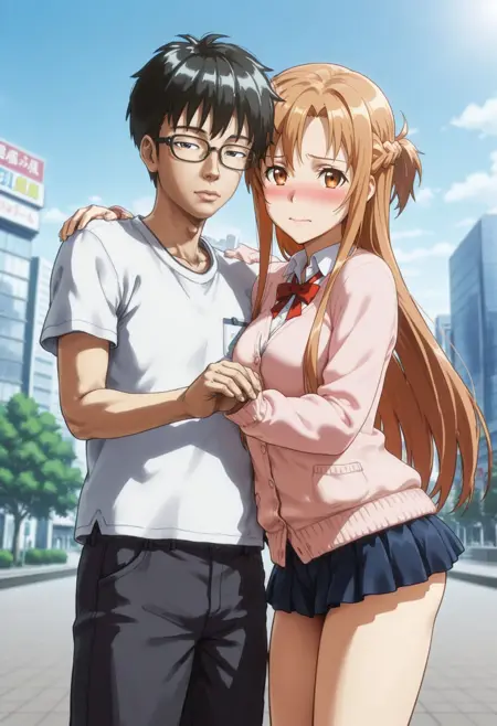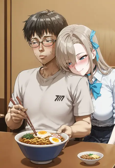 1boy, chigyu, chgy, glasses, ugly man, black-framed eyewear, glasses, lips, black eyes, black hair, nose, weak chin, short hair, narrowed eyes, <lora:chigyu_illustrious:0.8>, restaurant, gyuudon, table, sitting, chopsticks, couple, leaning on person,  ADDCOL 1girl, couple, leaning on person, restaurant, gyuudon, table, sitting, chopsticks