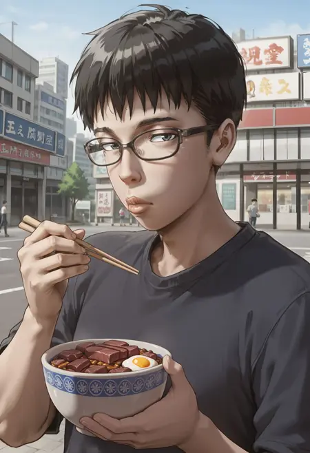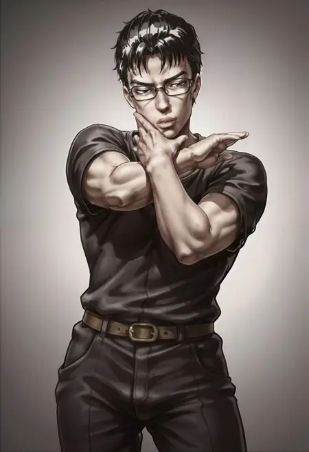1boy, chigyu, chgy, glasses, ugly man, black-framed eyewear, glasses, lips, black eyes, black hair, nose, weak chin, short hair, narrowed eyes, <lora:chigyu_illustrious:0.8>