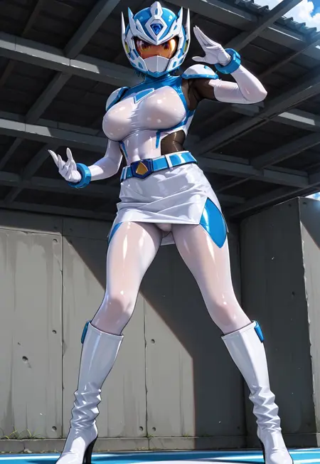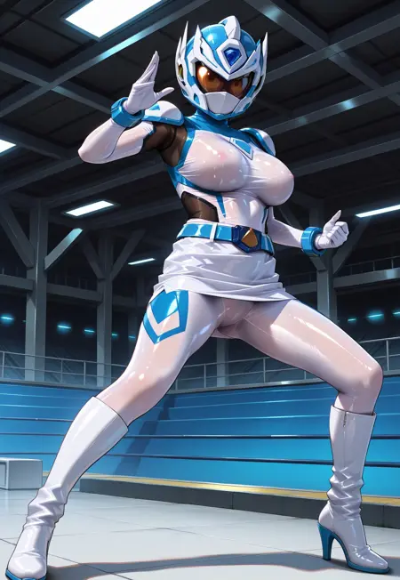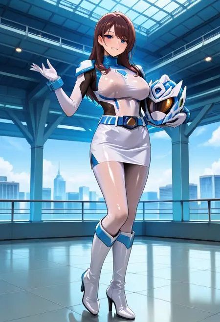 Bakushin Blue, helmet, bodysuit, gloves, belt, shoulder pads, big breasts, skirt, high heels boots,