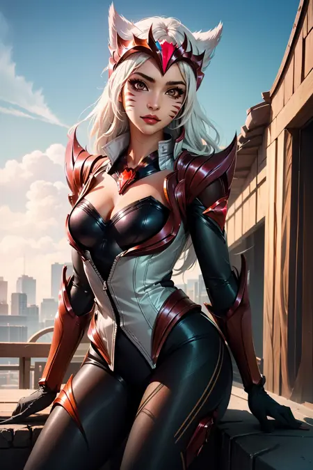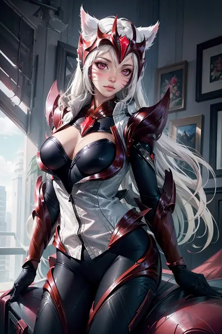 タグ:challenger ahri, 1girl, bodysuit, helmet, jacket, animal ears, whisker markings, cleavage, long hair, white hair