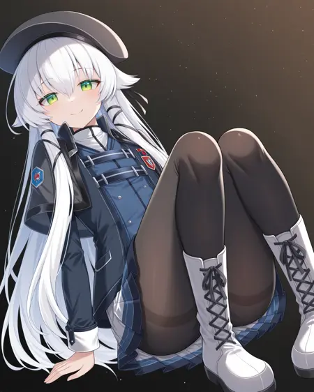 <lora:AltinaOrionThors_Illustrious:1>, Altina Orion, 흰 머리, 긴 머리, 측면 머리카락, 띠 리본, 녹색 눈, 평평한 가슴, 검은 모자, 파란 셔츠, 학교 유니폼, 치마, 검은 팬티후스, 흰 부츠,