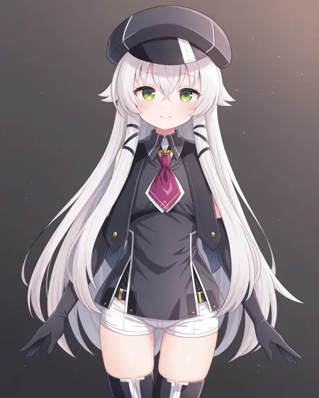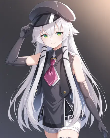 <lora:AltinaOrionCS4_Illustrious:1>, Altina Orion, 흰 머리, 긴 머리, 측면 머리카락, 녹색 눈, 평평한 가슴, 캐비 헤드셋, 소매 없는 검은 상의, 자홍색 넥타이, 검은 팔 장갑, 흰 반바지, 검은 허벅지 부츠,