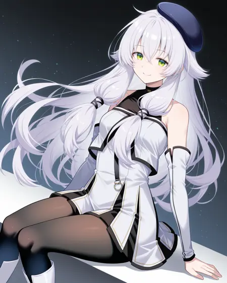 <lora:AltinaOrionThors_Illustrious:1>, Altina Orion, 白发, 长发, 侧发辫, 发带, 绿眼, 平胸, 黑帽, 蓝衬衫, 校服, 裙子, 黑色连裤袜, 白靴,