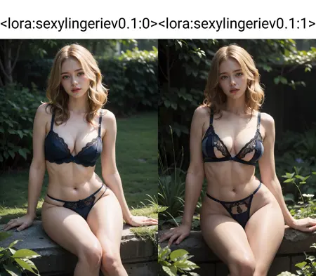 例如:full body shot, a photo of a beautiful woman standing in lingerie, blonde hair, garden, sexy lingerie, lora:sexylingeriev0.1:1