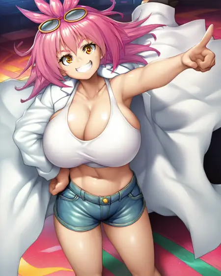 rune\(taimanin\),1girl,solo,standing,looking at viewer,huge breasts,goggles on head,white tank top,white coat,navel,shorts,jeans