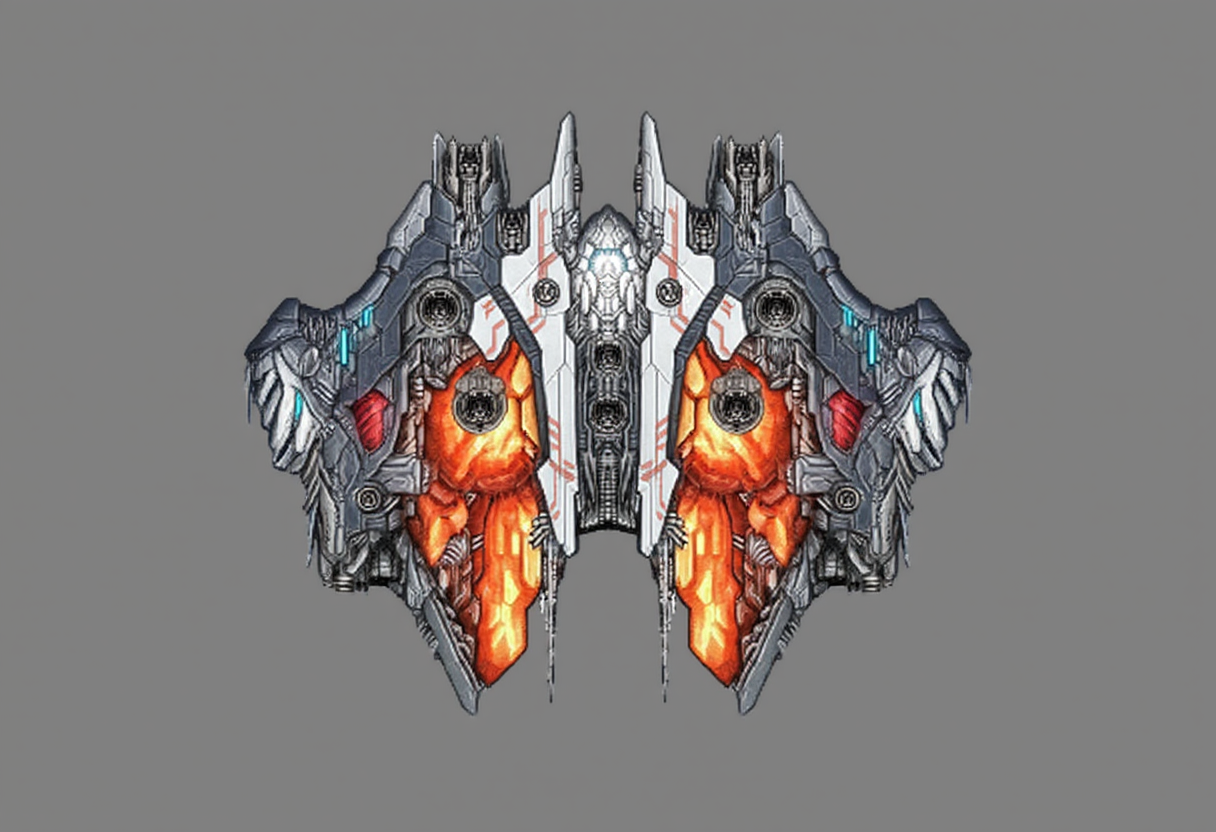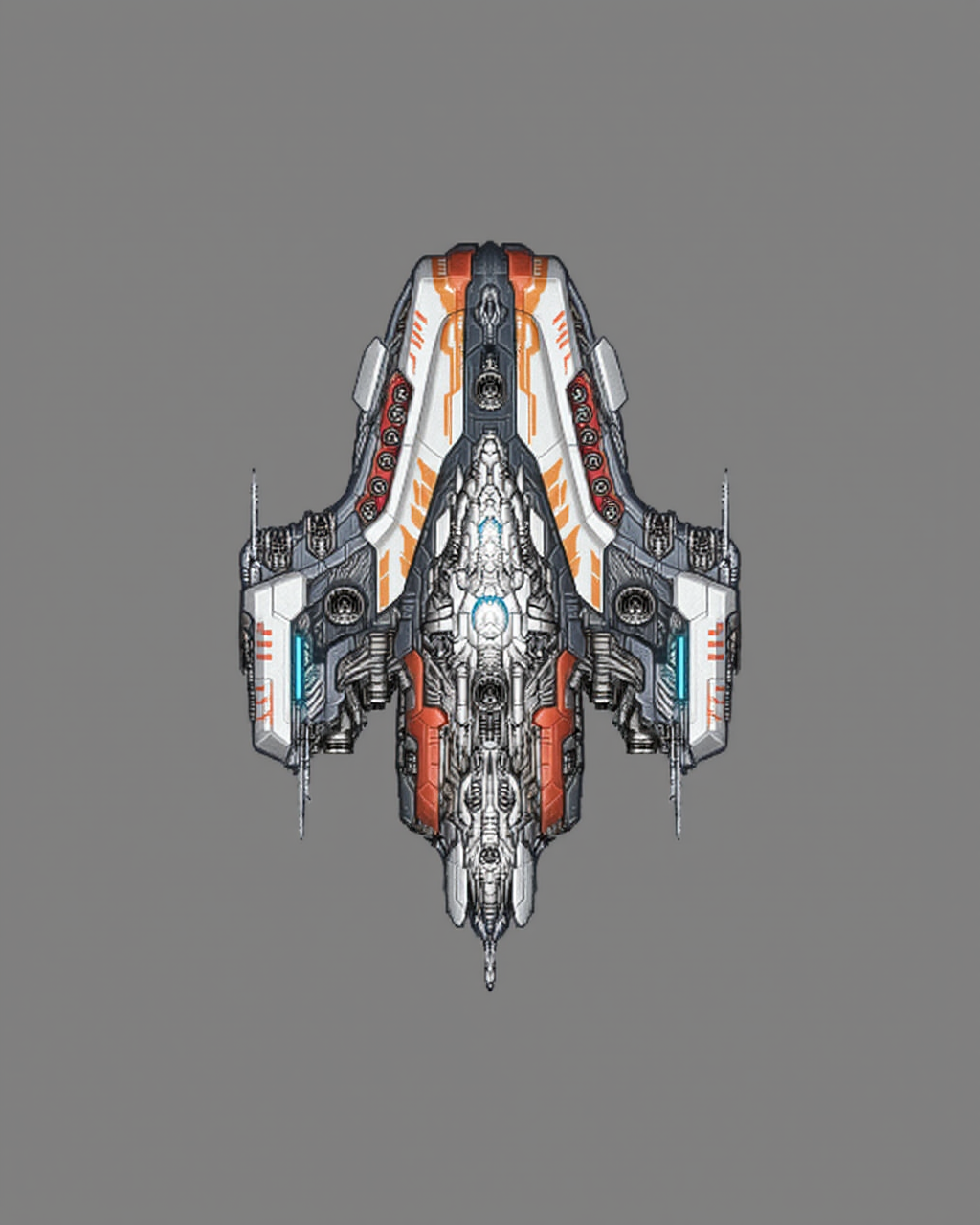 회색 배경 위의 Starsector 우주선의 2D 스프라이트 상단 보기.