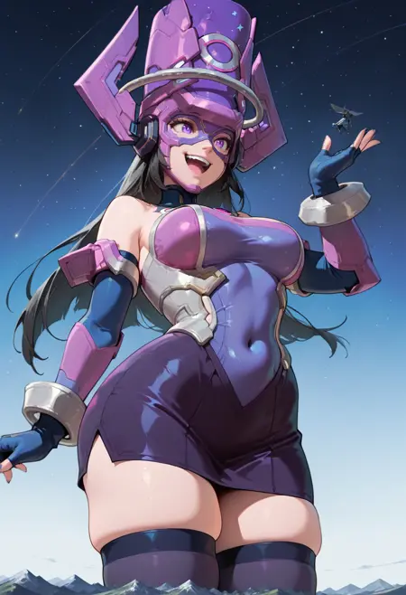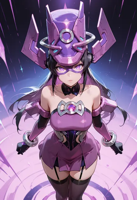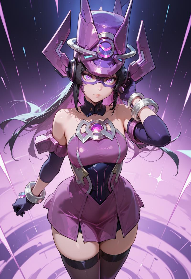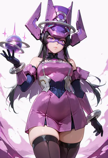 galacta, 1girl, solo, gloves, dress, thighhighs, looking at viewer, bracelet, jewelry,